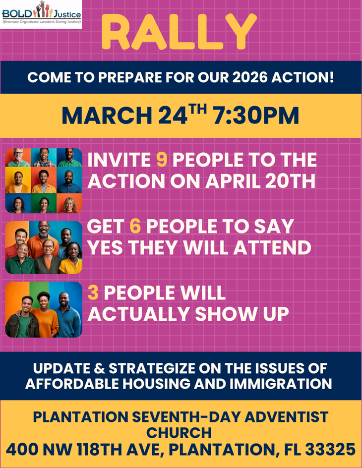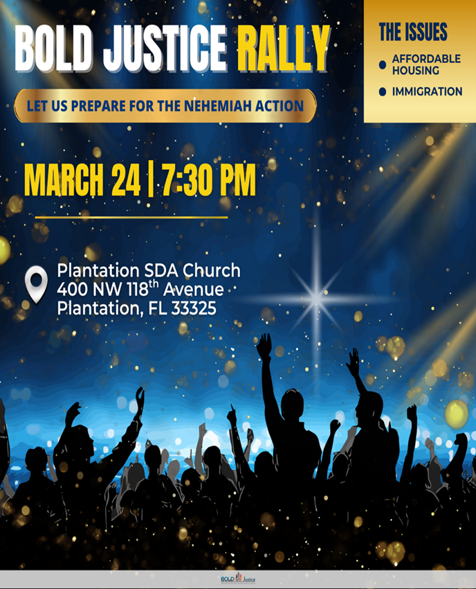 TUESDAY: BOLD Justice Rally at 7:30 p.m. at Plantation SDA, 400 NW 118 Ave. Plantation FL 33325