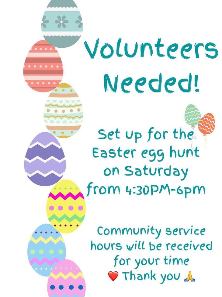 The Youth who will be helping with the set up for the Easter Egg hunt should arrive at 4:00 p.m.