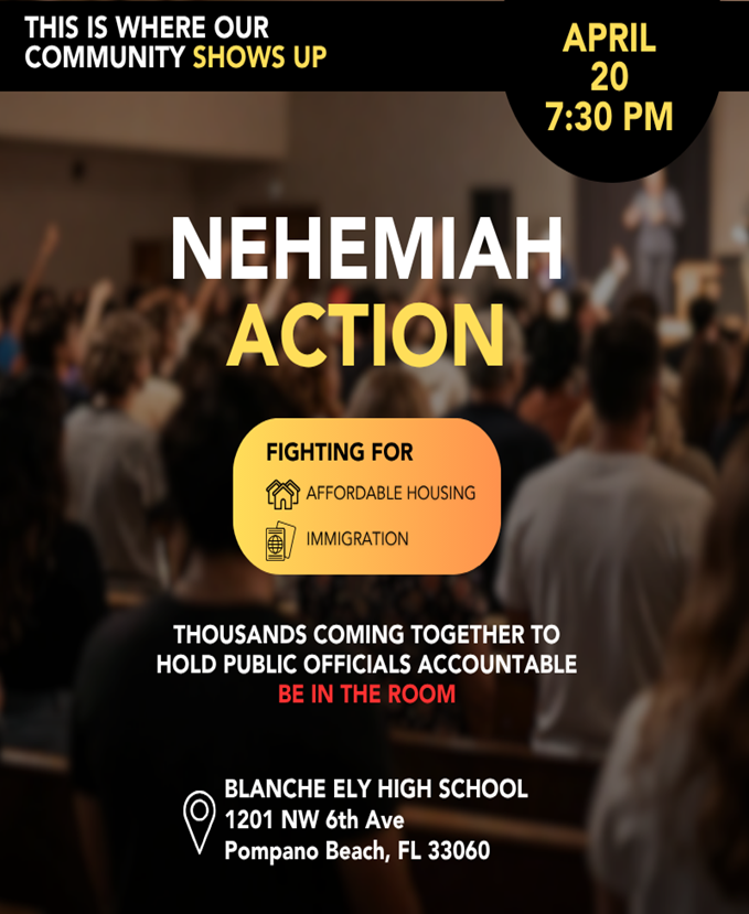 MONDAY, April 20 Nehemiah Action 7:30 p.m. at Blanche Ely High School, 1201 NW 6th Ave., Pompano Beach, 33060